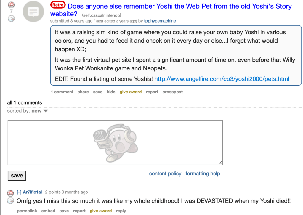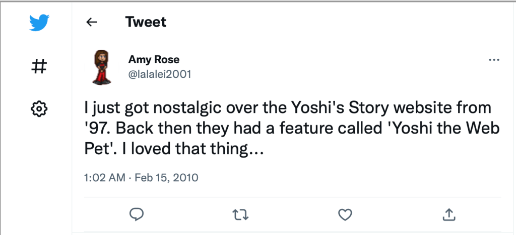 Yoshi, the Web Pet was one of the first games that I thought about when I wanted to make this blog. It’s such a unique concept for a game in general but the fact that it was one of the first virtual pet games makes it even more interesting. There has never been a Mario virtual pet game before or since, which is a shame since Yoshi, the Web Pet sounds like a very entertaining video game. I wish Nintendo would bring it back somehow, as either a mini game in another Mario or Yoshi game, or even as its own standalone game. This is definitely one of the most amazing obscure and lost media relating to the Yoshi franchise, and I hope we can learn more about this cute game in the future. I would also love to know if anyone has played Yoshi, the Web Pet before or has more information about this game. If so, I would love to hear more from you in the comments section below or by contacting me in the contact form on this blog.