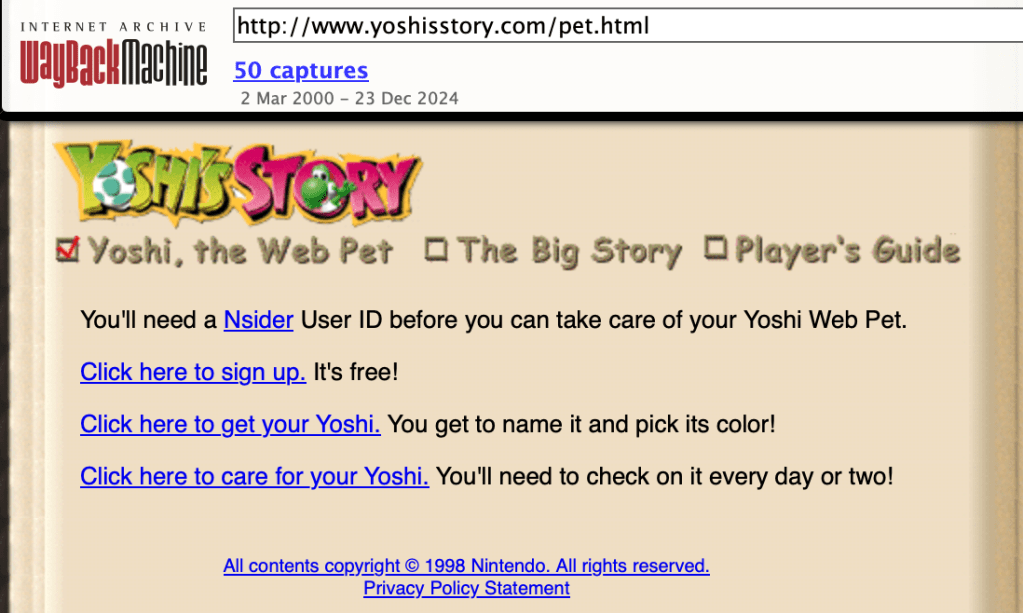 The game was available from 1998-2001. On Nintendo of America’s official site for Yoshi’s Story, there was an option to play the game below two other links to the Yoshi’s Story game. Yoshi, the Web Pet also had a dedicated fan base as shown on the website Yoshi’s Story Book. A fascinating fact about the online game is that it may be one of the very first virtual pet games ever released, as virtual pet games at that time were very rare compared to the present.