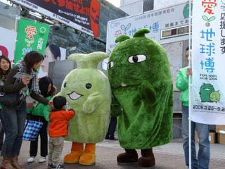 The second image depicts people with costumed mascots at the Expo 2005 in Aichi, Japan.