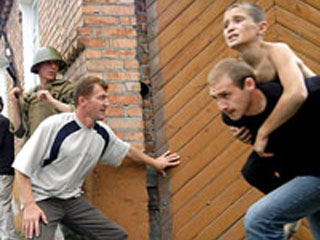 The third picture is the most controversial one of the group and shows people running and taking cover in Beslan, Russia with a soldier with green camo and a rifle in hand taking cover as well.